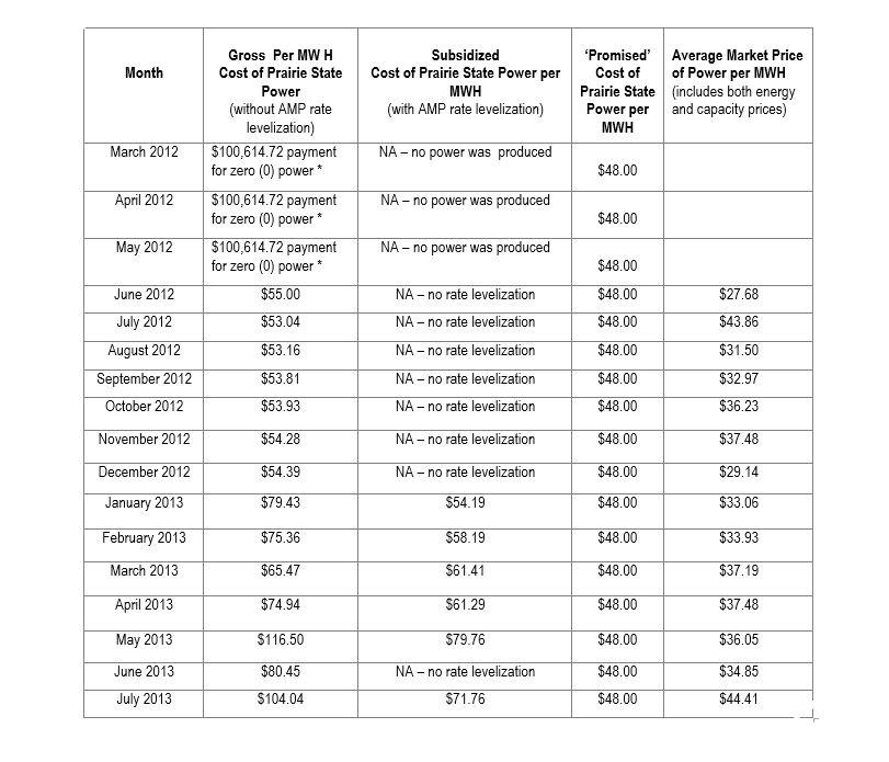 Note: in the months of January through May 2013, and again in July 2013, AMP included a “rate levelization” credit in Galion’s bills, meaning it was using funds from other sources, including bond proceeds, to bring the rates down somewhat. This money will have to be paid back eventually. In addition, this comparison excludes net congestion costs that are part of the Prairie State bill.