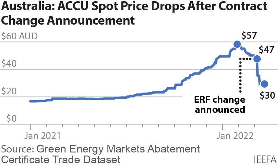 The Institute’s Lead Research Analyst for Australian Electricity, Johanna Bowyer, says ACCU prices were $47 before the ERF announcement. After the announcement, prices went into free-fall to hover around $30 in mid-March.
