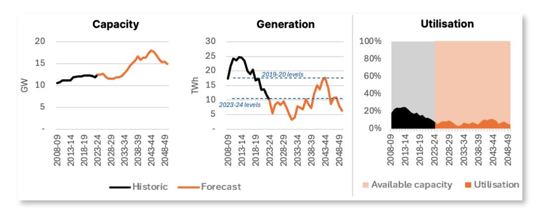 The need for gas power generation is expected to be below historic levels, and very small compared with the expansion of renewable generation and storage. As the role of gas narrows to focus on ‘peaking’ services, generators are expected to operate only 7% of the time on average.