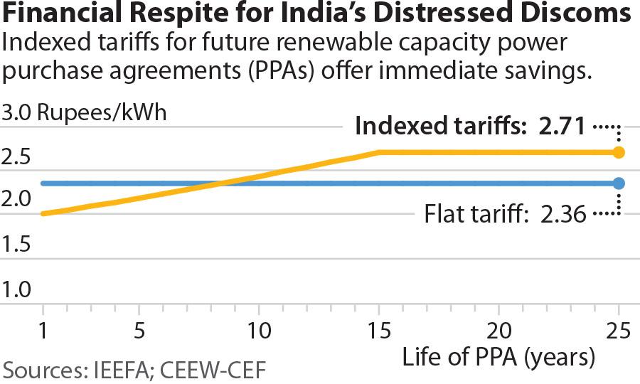 Front-ending tariffs at a rate of Rs2.00/kWh would not only give the discoms short- to medium-term relief, it would also provide them with an added incentive to increase purchasing of renewable energy instead of coal-fired power. Though the note says the need for indexed over flat solar tariffs to displace coal would taper off by 2025/26 as flat solar tariffs will decline below Rs2.00/kWh levels.