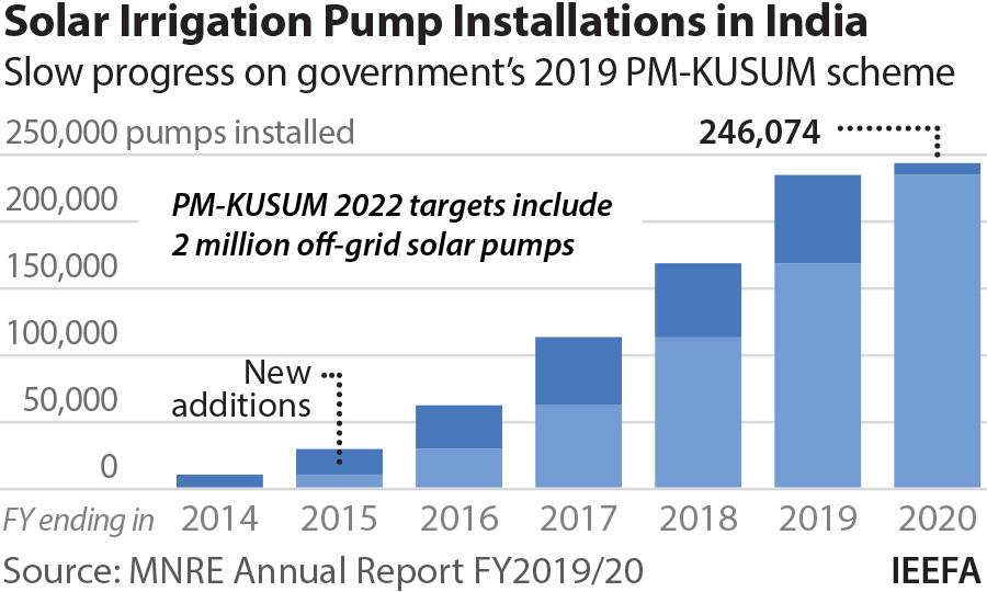 11 June 2021 (IEEFA India): India’s mission to deploy some 2 million off-grid solar-powered irrigation pumps is making sluggish progress, with only one-eighth of the target achieved so far, according to a new report from the Institute for Energy Economics and Financial Analysis (IEEFA) which urges the central and state governments to remove bottlenecks in the installation of solar pumps.