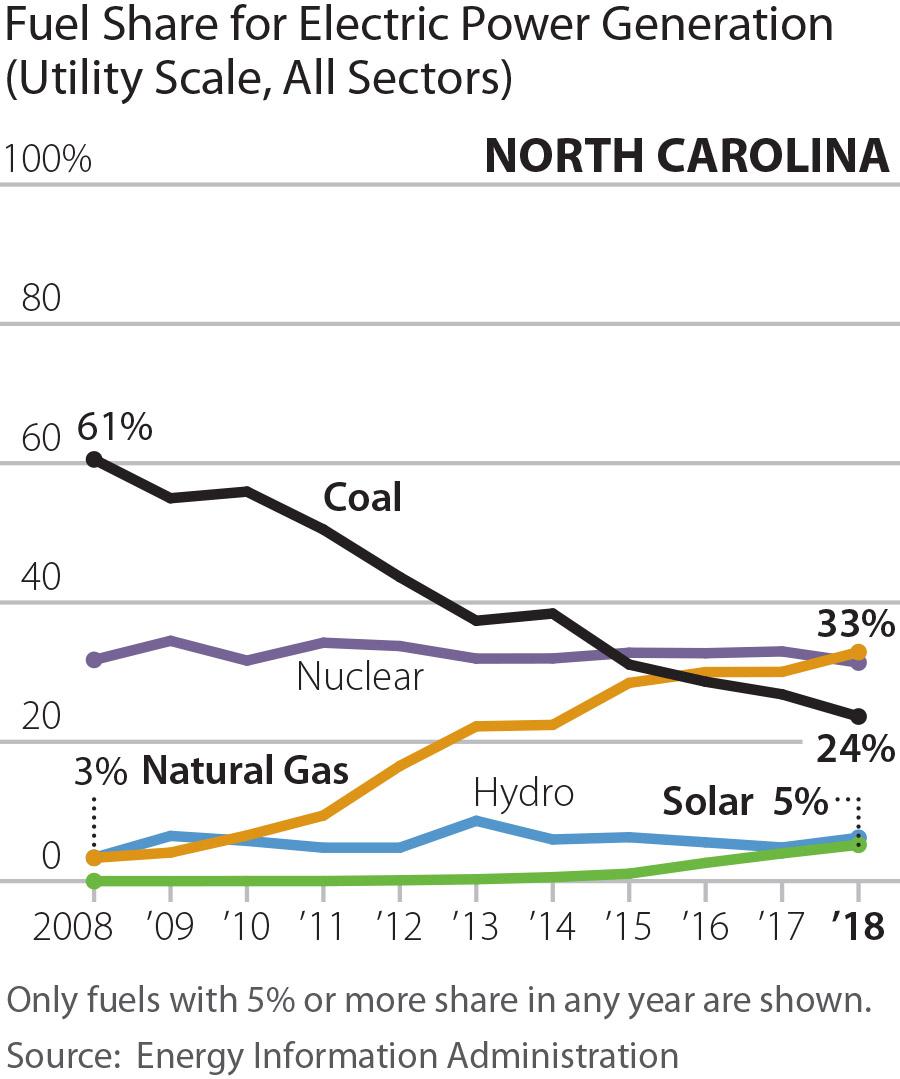 The report—Coal-Fired Power Generation Is In Freefall Across the Southeast U.S.—examines the regional transition away from coal from 2008-2018, showing how the surge in gas supplies from hydraulic fracturing and horizontal drilling has irreversibly altered the outlook for electricity generation—outpacing even the accelerating national trends over the past 10 years. In 2008, states in the region generated 52% of their electricity from coal, compared to a national average of 48%. By 2018, while the national average fell to 28%, in the Southeast it dropped to 22%.