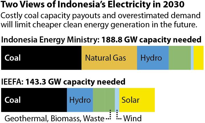 The problem is most acute in Java-Bali, where IEEFA calculates current capacity, supplemented by renewable energy, is already sufficient to cover energy needs until 2026.