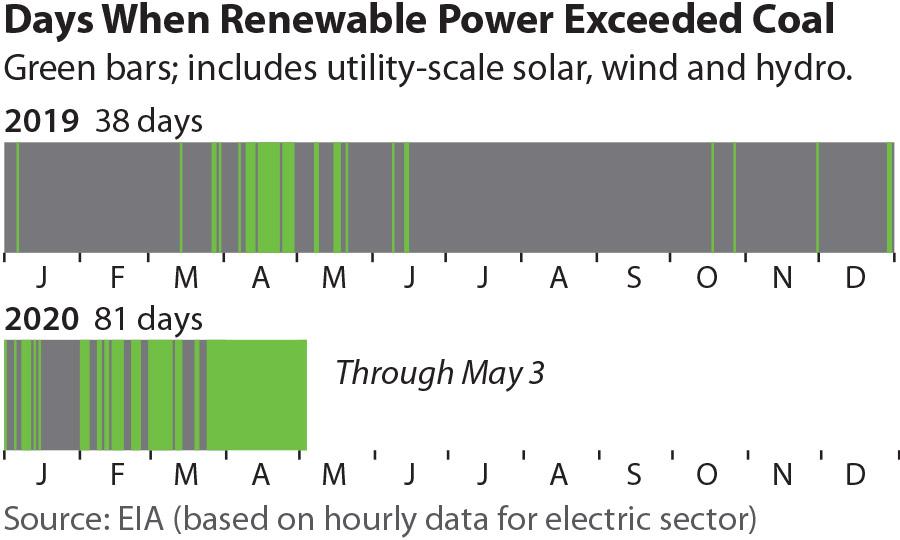 Days When Renewable Power Exceeded CoalThe transition away from coal for electricity generation has accelerated in 2020 due to a number of factors, particularly low gas prices, warmer weather, a significant amount of new renewable capacity connecting to the grid late last year, and more recently, lower power demand from the economic slowdown because of the coronavirus.
