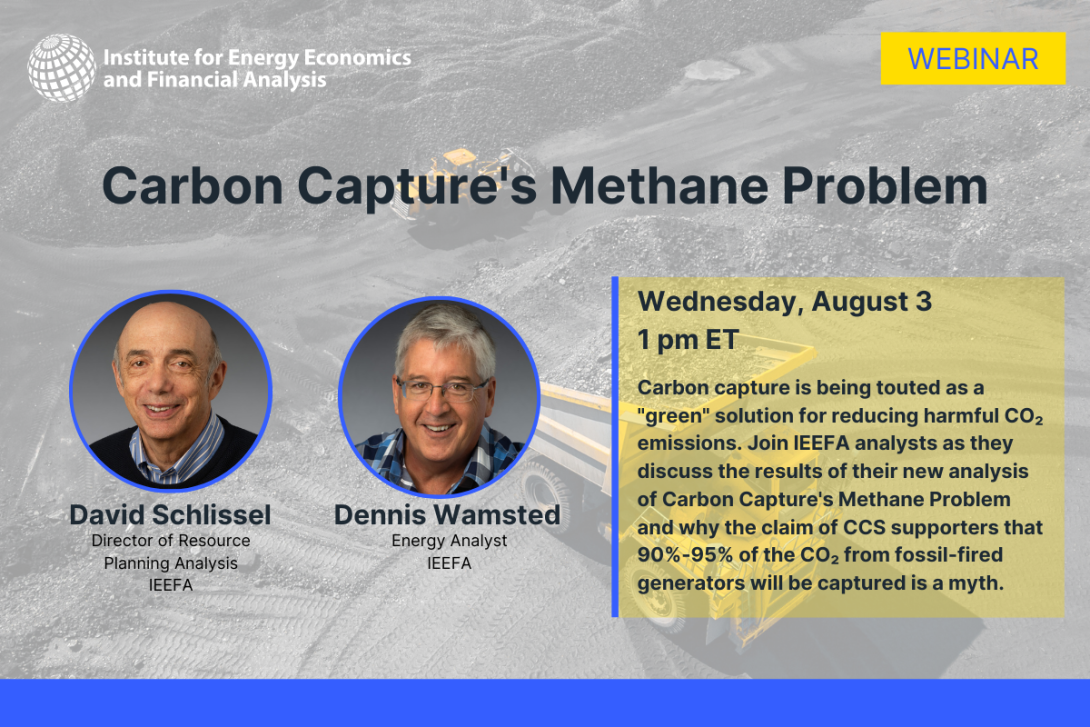 Carbon capture is being touted as an effective "green" solution for reducing harmful CO2 emissions. IEEFA analysts David Schlissel and Dennis Wamsted present the results of their new analysis of Carbon Capture's Methane Problem and why the claim of CCS supporters that 90%-95% of the CO2 from fossil-fired generators will be captured is a myth. View Webinar.