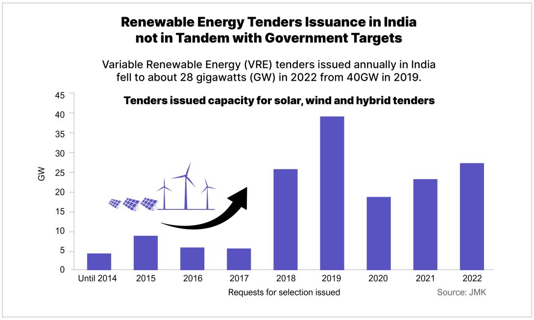 Variable Renewable Energy (VRE) tenders issued annually in India have fallen to about 28 gigawatts (GW) in 2022 from 40GW in 2019.
