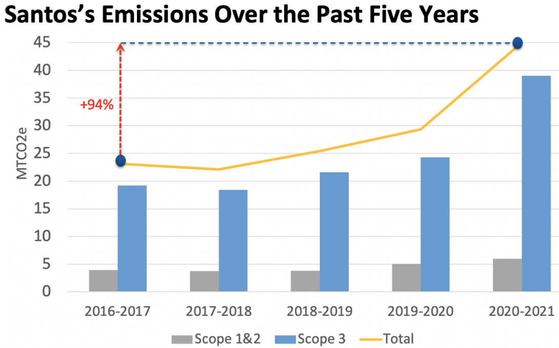 Despite targeting net-zero, Santos’s total emissions grew by 53% over the year to June 2021 and by 94% over the past five years, according to its 2022 Climate Change Report.