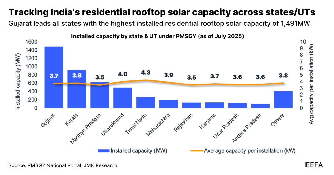 Under PMSGY, Gujarat leads all states with the highest installed residential rooftop solar capacity of 1,491MW, followed by Maharashtra, Uttar Pradesh, Kerala, and Rajasthan. These states together account for approximately 77.2% of the total installed capacity (4,946 MW) under the scheme till July 2025.