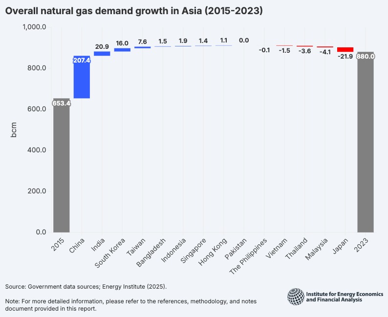 The report analyzes trends in sectoral gas consumption and natural gas production, LNG imports, annual LNG spending, and average import prices in Asia using official government sources, converted to equivalent units and standardized categorizations.