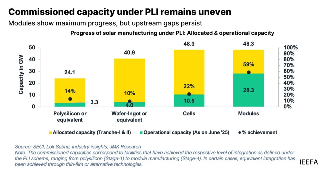 Launched in 2021, the Production Linked Incentive (PLI) scheme for high-efficiency solar modules has attracted strong industry interest and revived investor confidence in domestic solar manufacturing. However, capacity additions remain below targets, with only 56% of module and 14% of polysilicon capacity achieved as of June 2025.