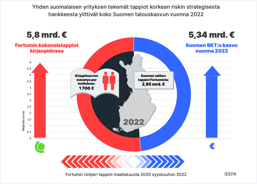 Fortum kertoi toukokuussa, että sen rahalliset nettotappiot niin sanotusta "Venäjän matkasta" olivat 2 miljardia euroa. Koska tähän 2 miljardiin euroon eivät kuitenkaan sisälly Venäjään liittyvät Uniper-tappiot, luku aliarvioi Fortumin Venäjän-tappioita, eivätkä osakkeenomistajat IEEFA:n mukaan välttämättä hahmota tappioiden laajuutta.