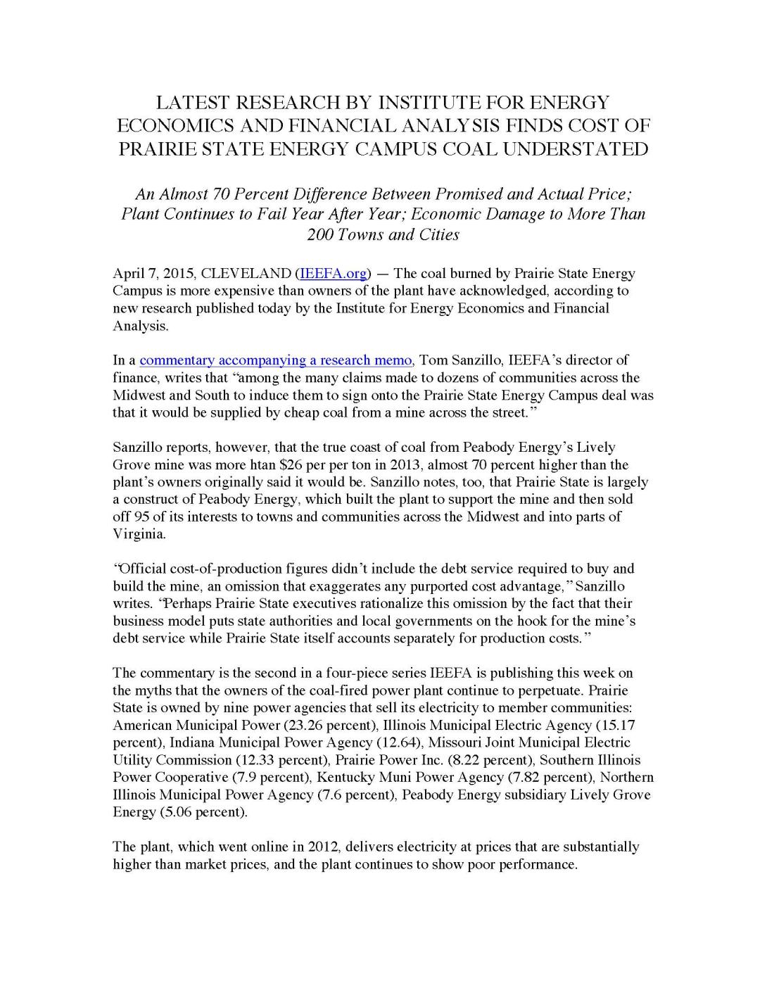 April 7, 2015, CLEVELAND (IEEFA.org) — The coal burned by Prairie State Energy Campus is more expensive than owners of the plant have acknowledged, according to new research published today by the Institute for Energy Economics and Financial Analysis.