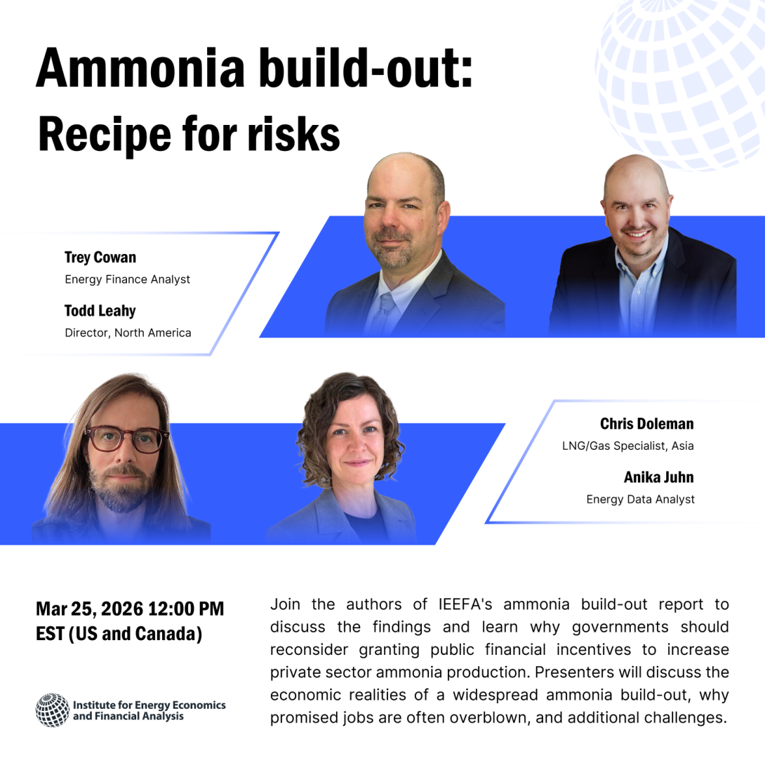 Join the authors of IEEFA's ammonia build-out report to discuss the findings and learn why governments should reconsider granting public financial incentives to increase private sector ammonia production. Presenters will discuss the economic realities of a widespread ammonia build-out, why promised jobs are often overblown, and additional challenges.