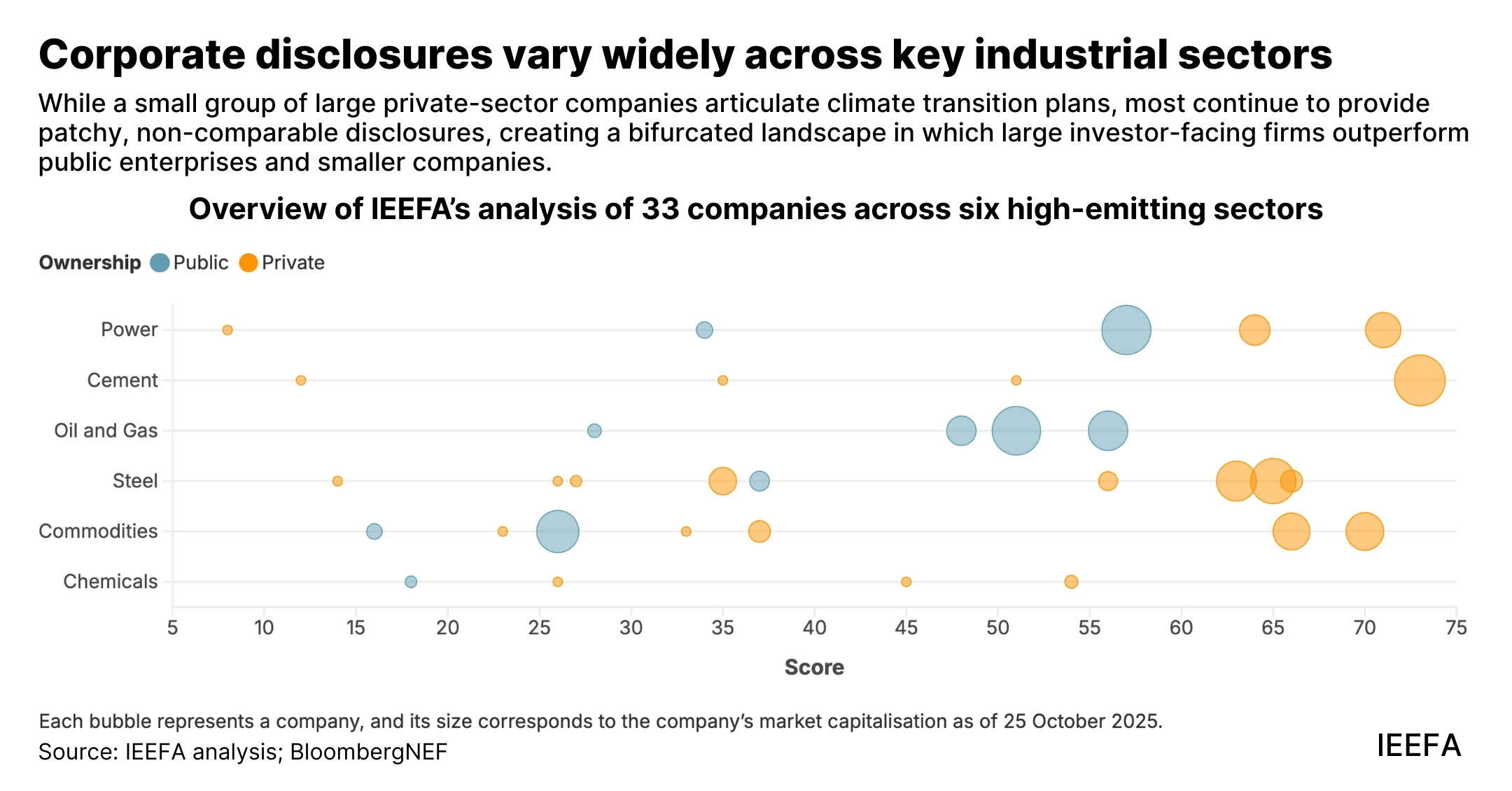 A recent Institute for Energy Economics and Financial Analysis (IEEFA) study of public disclosures on climate transition planning by key entities in high-emitting sectors in India reveals a clear divide. Large globally exposed companies outperform small and mid-sized firms, and also public sector peers, in transition planning disclosures.