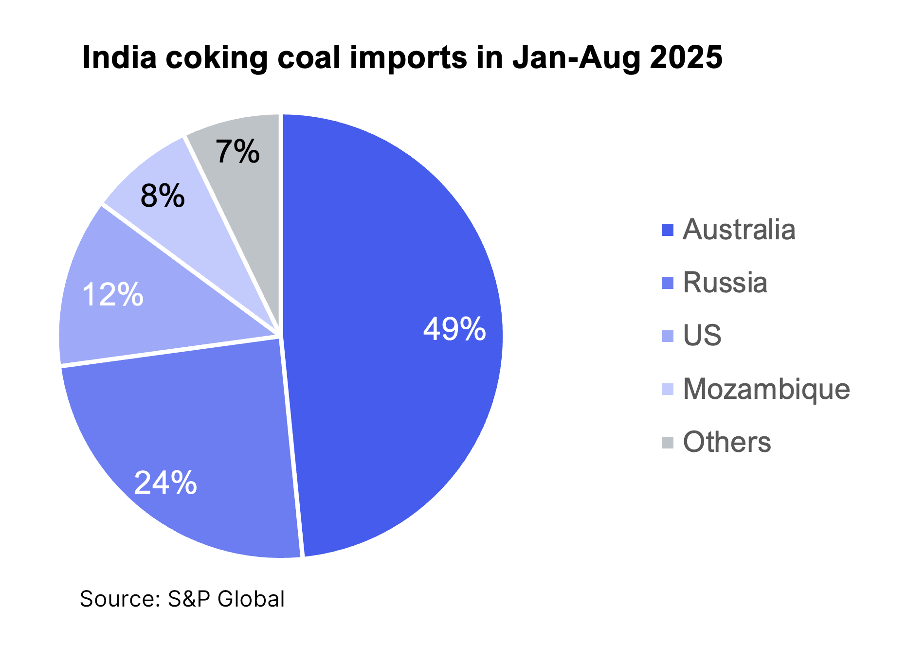 According to S&P Global, India received 54.5 Mt of coking coal in the January-August 2025 period. Of this, Australia supplied 26.4 Mt (49%), while Russia supplied 13.3 Mt (24%), the US 6.7 Mt (12%), and Mozambique 4.2 Mt (8%).