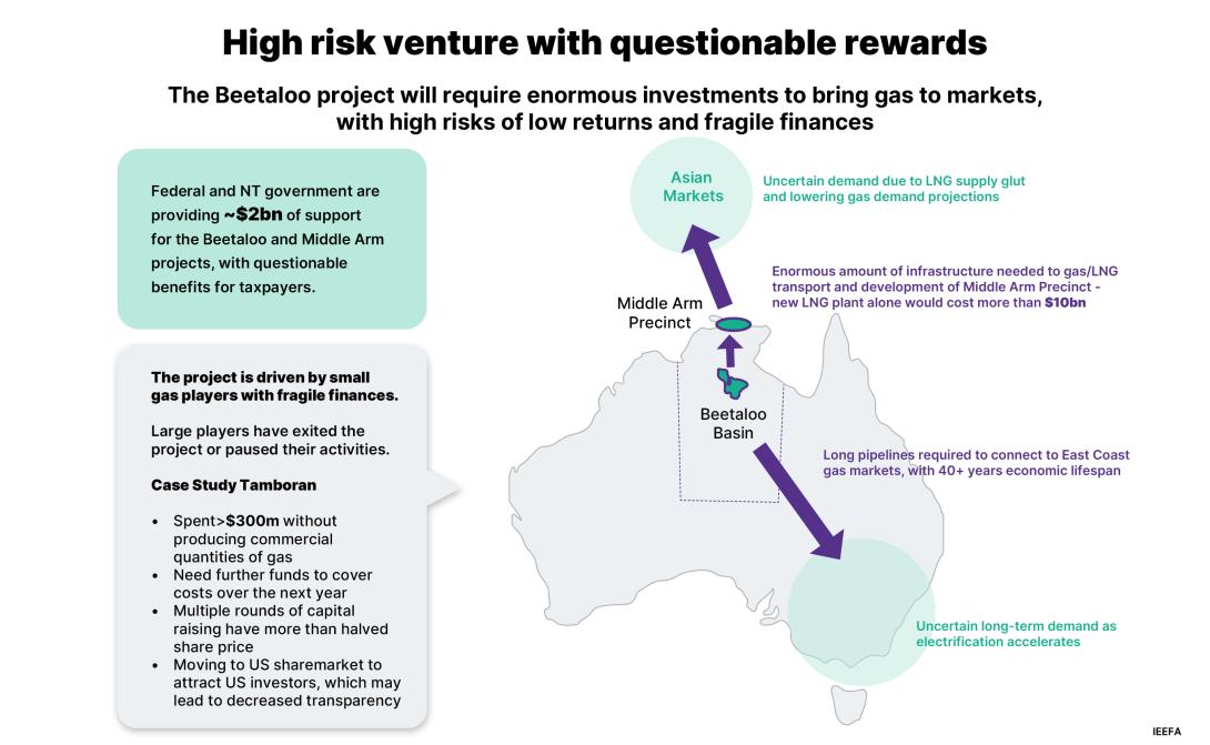 There are significant questions on the financial and economic benefits that will be delivered by the development of the Beetaloo Basin, for investors as well as for governments. The proposed public financial support offered to the project and the Middle Arm precinct should be revisited in light of the changing domestic and global outlook for both gas demand and supply.