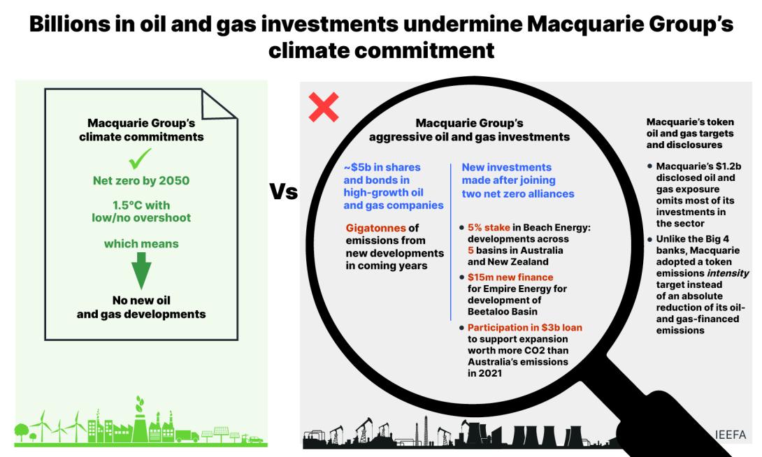 Macquarie Group presents itself as a leader in the global transition to net zero emissions by 2050, but its billions of oil and gas investments are at odds with its commitment to the 1.5°C goal.