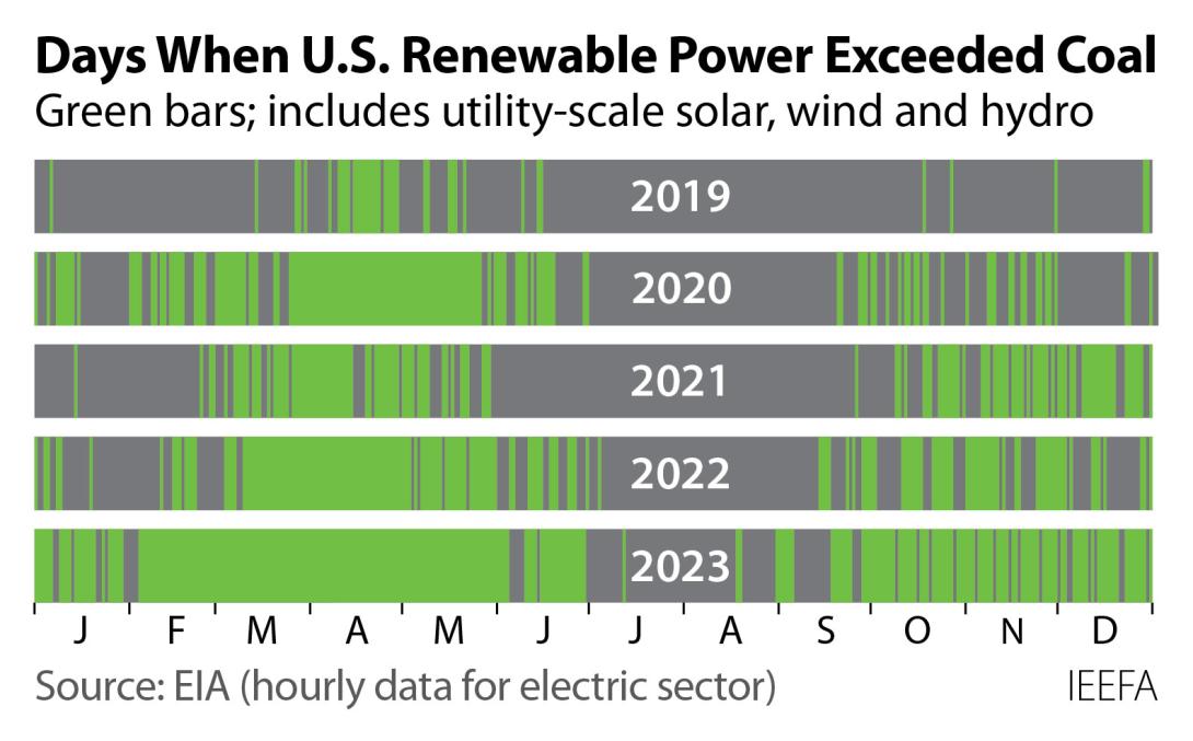 The 2023 figures stand in sharp contrast to 2019, when coal provided more than 20% of U.S. power on 335 days, including more than 25% on 90 days. Renewables provided more than 20% on 188 days last year, including 57 days at 25% or more, and the figures are certain to rise with increased solar and wind generation through 2025.