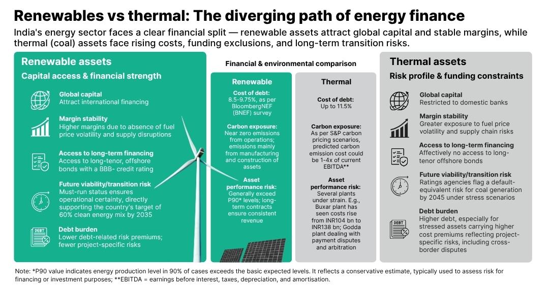 Offshore bond markets offer a selective and fragile channel. Only renewable players are actively raising capital via USD-denominated bonds; thermal-linked credits are structurally absent, with Tata Power's 2021 bond repayment marking an effective exit. Even within the renewable segment, issuance has been highly episodic and macro-sensitive. India sovereign rating — essentially an assessment of a country's creditworthiness — receiving an upgrade in 2025 opens a potential re-entry point, enabling longer tenors and tighter spreads. But translating that into sustained offshore market access will require both issuer-level credit discipline and a degree of global funding stability that cannot be assumed.