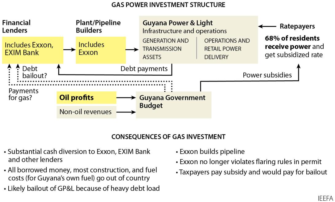 The overbuilding that results from the Gas to Energy project will undermine Guyana’s promise to meet its climate goals. The country will go into debt for no good reason, and the money borrowed will go to build gas infrastructure that will be financed largely by foreign financiers and built by largely foreign workers. To finance the Gas to Energy project, Guyanese officials will effectively take a substantial portion of Guyana’s future profit oil from the Payara and Liza offshore wells being drilled by an ExxonMobil-led consortium. Over the longer term, Guyanese taxpayers and ratepayers are likely to have to pay for the fluctuating prices of natural gas, notwithstanding public promises from the government that future gas supplies will be free.