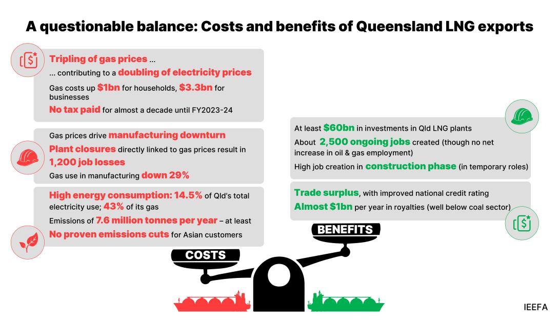 LNG exports have tripled gas prices, costing households and businesses an extra AU$4.3 billion in FY2023-24. High gas prices also contributed to a doubling in electricity prices and higher inflation.
