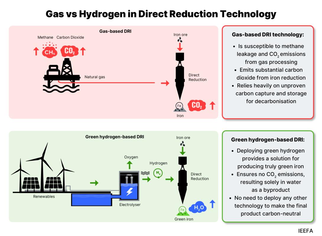 Gas-based DRI has lower emissions than coal-fired blast furnaces, but still emits significant CO2. Carbon capture and storage technology (CCS) is unable to effectively decarbonise gas-based steelmaking.