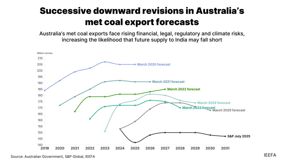- Over-optimistic forecasting despite declining exports: The Australian government has a clear track record of over-estimating its met coal export forecasts, having revised its projections downward each year for the past six years with actual exports in decline. Given this gap, India should not rely on Australian government forecasts of increased met coal exports.