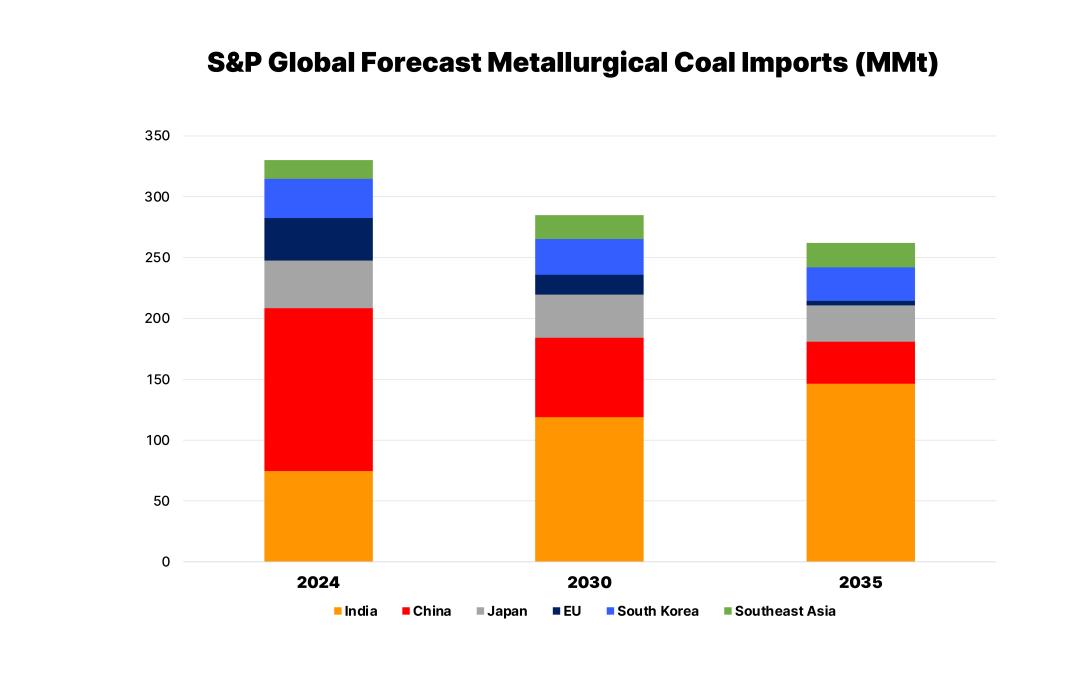 S&P Global forecasts a slow decline in Australian exports to 2035 but the risk looks to be on the downside as India seeks to increase domestic met coal production, and diversifies imports away from Australia.