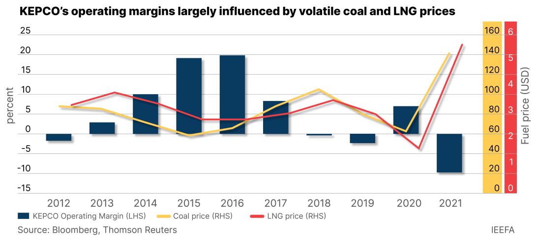 Our analysis found that KEPCO had been slow to switch to renewables compared to its global peers. Instead, the company had been doubling down on fossil fuels even while the evidence was clear that high and volatile coal and LNG prices largely determined its operating margins. As KEPCO had done nothing to correct its investment decisions, the inaction led to recurring operational losses for most of the last decade and a steady increase in debt despite the company already being overleveraged.