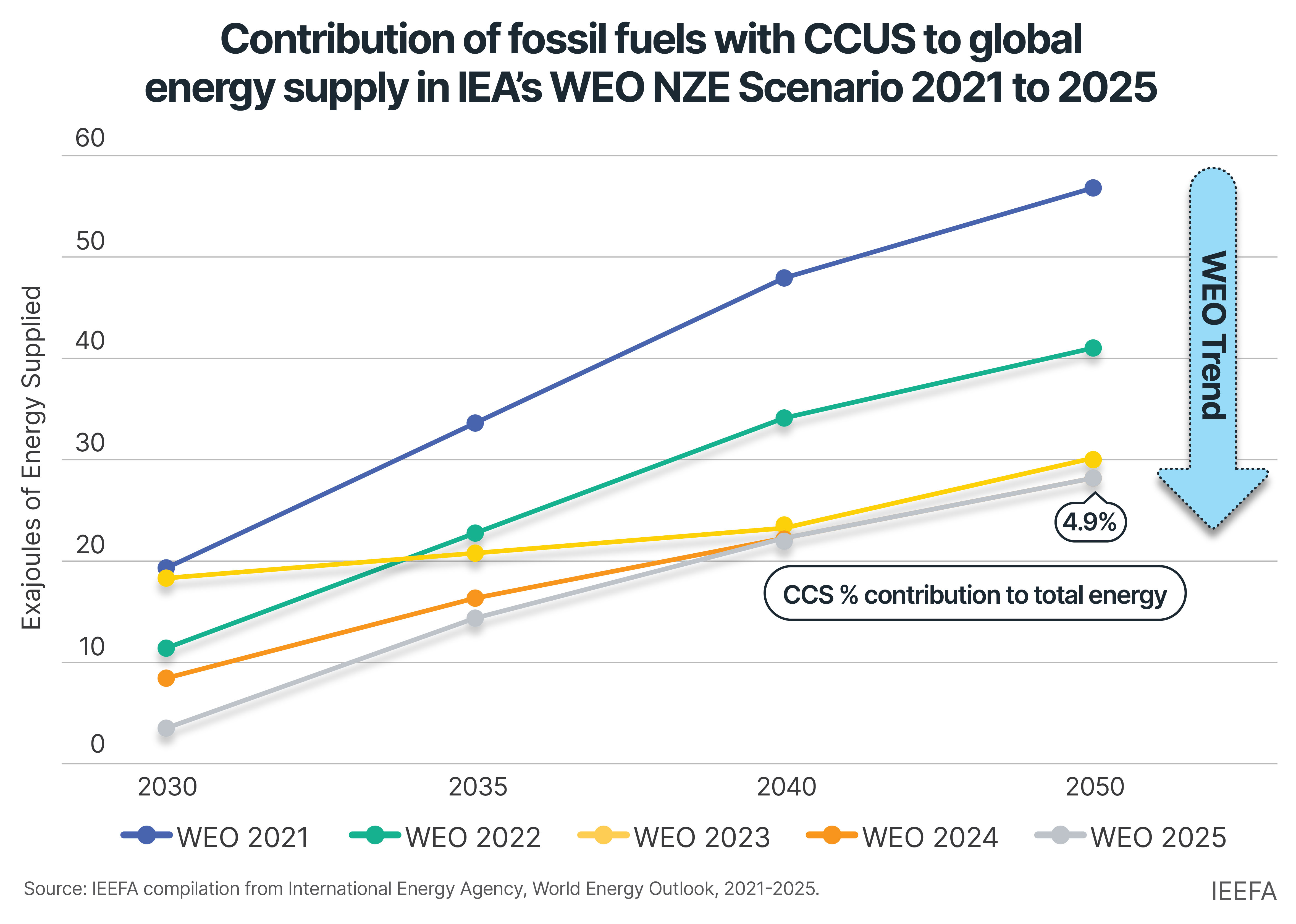 CCUS projects have been delayed, canceled, or failed to materialize, often due to unfavorable economics, despite claims of the technology’s “vital” role in decarbonization. The IEA’s WEO 2025 data indicates that, even in the NZE Scenario, CCUS is not essential to achieving decarbonization.