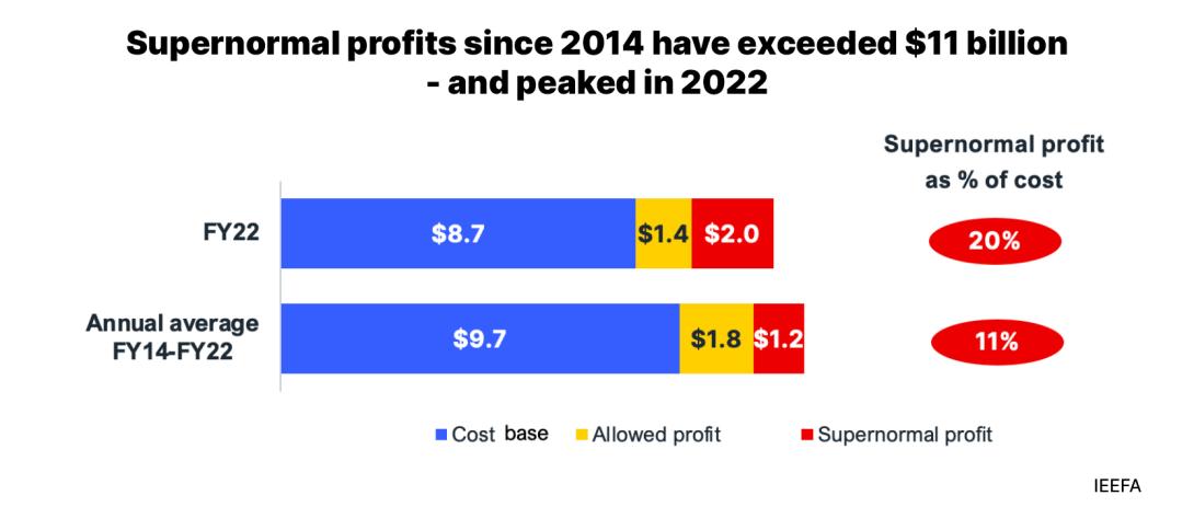 IEEFA estimates electricity networks extracted $2 billion of supernormal profits in FY22 – making total profits 2.5 times the levels necessary to compensate shareholders for risk.