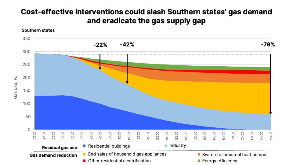 Untapped, cost-effective interventions to improve gas efficiency and expedite electrification could slash gas demand by more than 40% by 2030 in Australia's southern states’ residential buildings and industry.