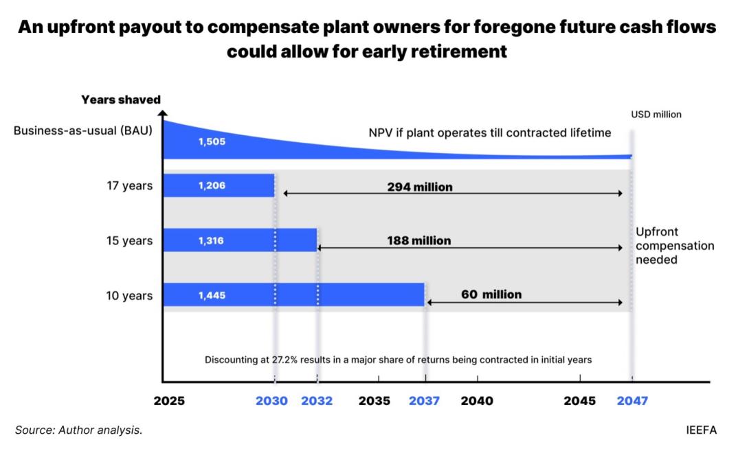 Early retirement of Sahiwal CFPP is economically viable within a USD0.4–1.5 billion compensation range, with modest 5–10 year acceleration scenarios. This could cost under USD100 million, compared to USD5 billion in continued capacity payments through 2046.