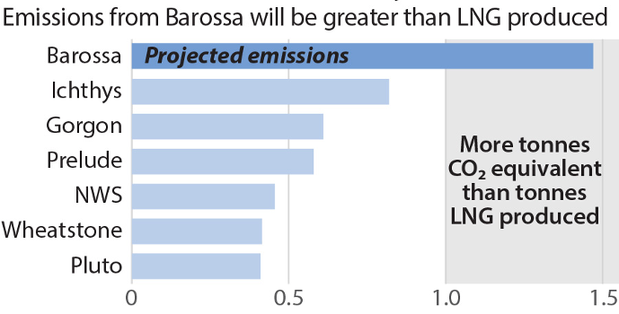 Barossa gas is the dirtiest gas used to make LNG in Australia, in terms of its 18 volume percent carbon dioxide content. It is three times higher than the nearly depleted Bayu-Undan gas (in the Timor Sea) that the Darwin liquefied natural gas (LNG) plant currently processes. Barossa’s CO2 content is six times higher than in the gas processed in the NWS LNG plant in WA.