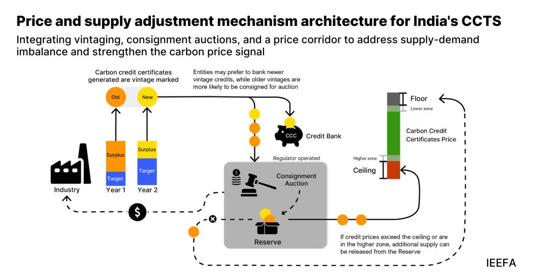 This report recommends a stability mechanism tailored to India’s CCTS that comprises three elements: a consignment auction system for transparent, rule-based credit interventions; a vintage-based credit classification to limit the impact of older surplus credits on future prices; and an existing price corridor to guide interventions when carbon prices deviate from expected levels.