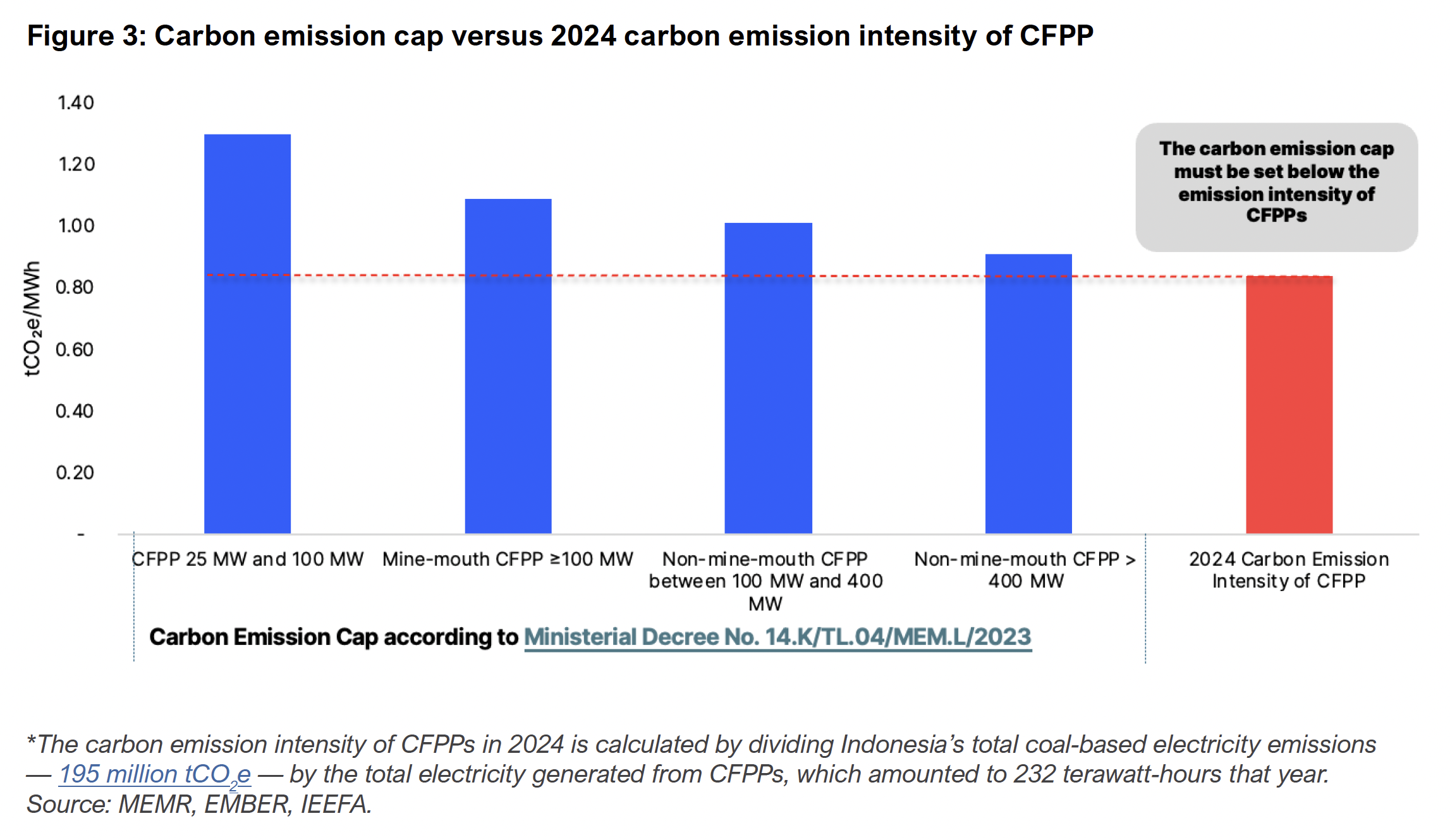 Currently, the carbon market is limited to coal-fired power plants (CFPPs), with 245 registered participants and a combined installed capacity of 54 gigawatts. The sectoral caps are defined in Ministerial Decree No. 14.K/TL.04/MEM.L/2023, which establishes differentiated emission thresholds based on plant type and capacity. For CFPPs with capacities between 25 and 100 megawatts (MW), the cap is 1.297 tCO2e per megawatt-hour (MWh). Mine-mouth CFPPs of 100MW or above face a lower cap of 1.089 tCO2e/MWh. Non-mine-mouth CFPPs between 100MW and 400MW must comply with a cap of 1.011 tCO2e/MWh, while the most stringent cap, 0.911 tCO2e/MWh, applies to non-mine-mouth CFPPs above 400MW.