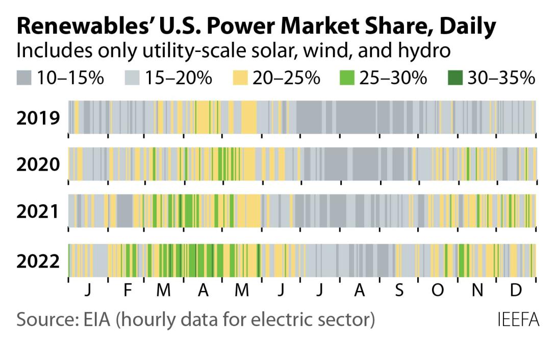 The market share of renewables in the U.S. topped 20 percent for 191 days in 2022.