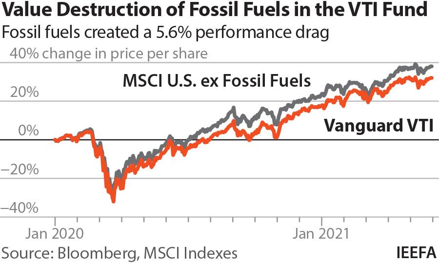 For the better part of a decade, the performance drag of fossil fuel investments has been substantial. Take for example Vanguard’s largest fund, the Total Market Index Fund (VTI) which has over US$1.2 trillion in AuM (>15% of Vanguard’s total assets, and coincidentally the world’s largest fund). Since January 2020, the VTI underperformed by ~5.6% versus a comparable benchmark which excludes fossil fuels. A significant amount of value has already been destroyed in the >US$1.2 trillion in investments in the fund. This may only be the beginning of profound wealth destruction, as financial losses (for instance, related to damages and insurance) are only expected to escalate as more extreme weather events more frequently occur.