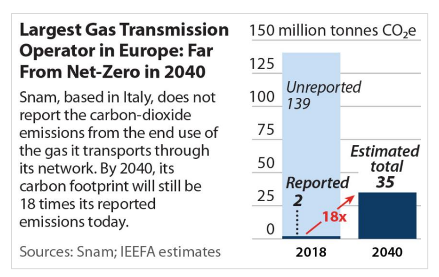 Far from becoming net-zero, in 2040 Snam will be contributing at least 18x its total reported emissions today.