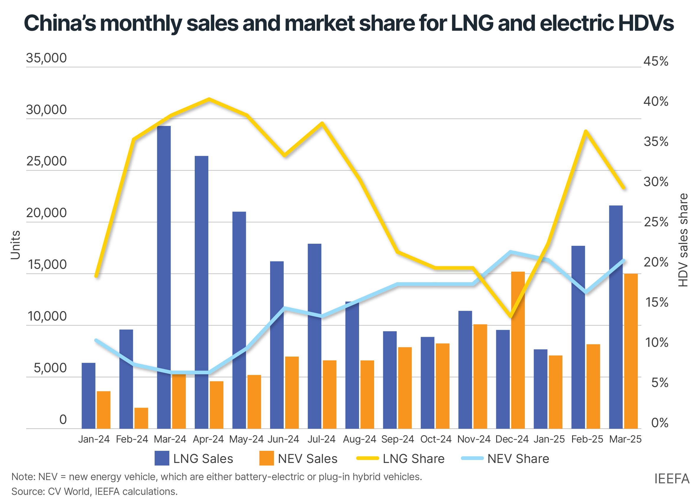 In the first quarter of 2025, the electric segment captured almost 20% of HDV sales, up from 8.1% a year ago. LNG sales constituted 31% of the market, down from over 33% in 2024.