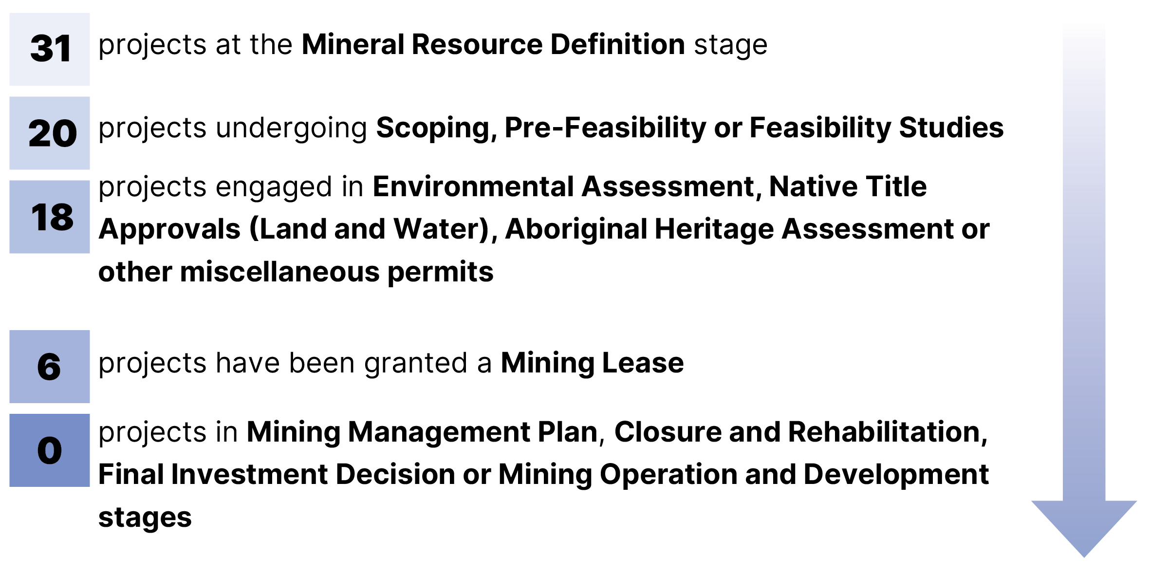 The journey from initial exploration to full-scale production can span many years. To better understand the progress of magnetite projects, particularly those aiming to supply feedstock for low-emissions ironmaking, each deposit has been classified according to one of seven key development stages, with each stage representing a major milestone along the path to production. While the progression and regulatory requirements may vary by project and by state, this framework provides a consistent way to assess the maturity of each project.
