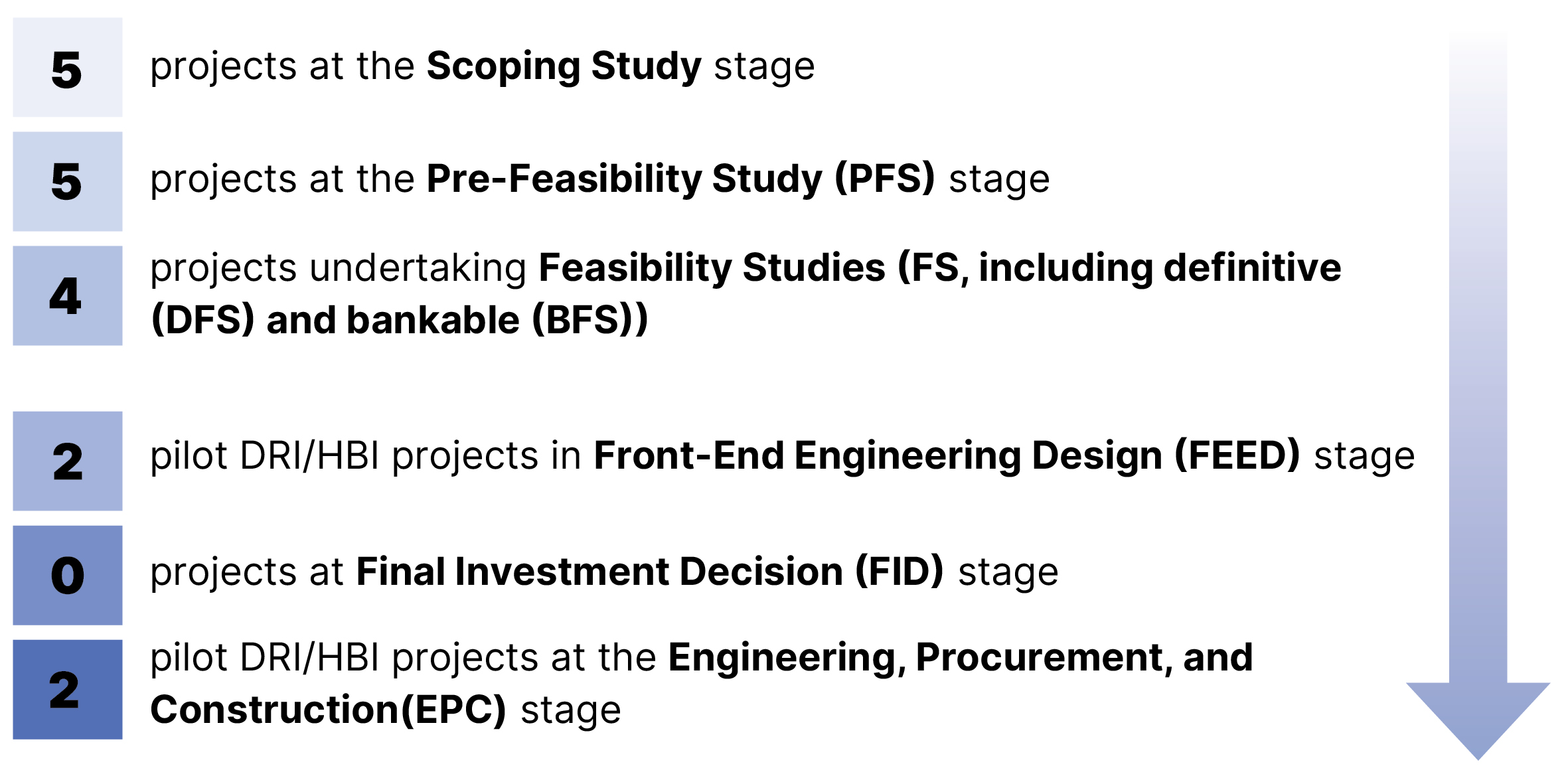 With the exception of two pilot-scale DRI/hot briquetted iron (HBI) projects currently under construction, none of the large-scale projects in the pipeline have reached final investment decision (FID). The majority remain in early planning phases, such as scoping or pre-feasibility studies.