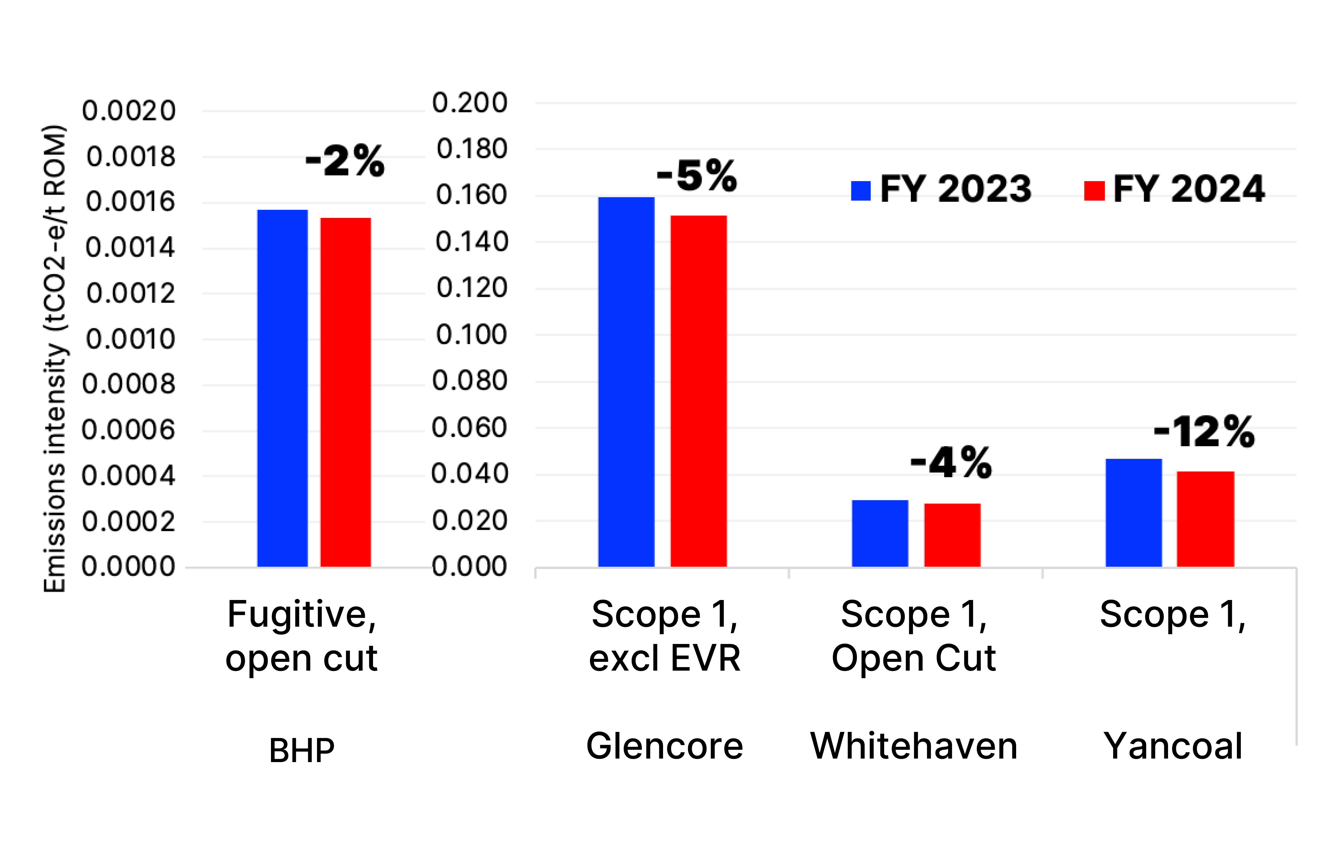 Glencore’s Hail Creek mine reported increased methane emissions from the switch, by more than 3.5 times to 0.111tCO2e/tROM. This result is not surprising, given that this mine has been the subject of recent research by the International Methane Emissions Observatory and the University of NSW. They used aerial surveys to measure methane being emitted from the mine. It was the first study to use high-resolution top-down verification of methane. They observed emissions, which, if extrapolated over an entire year, could be three to eight times greater than reported for FY2022-23.