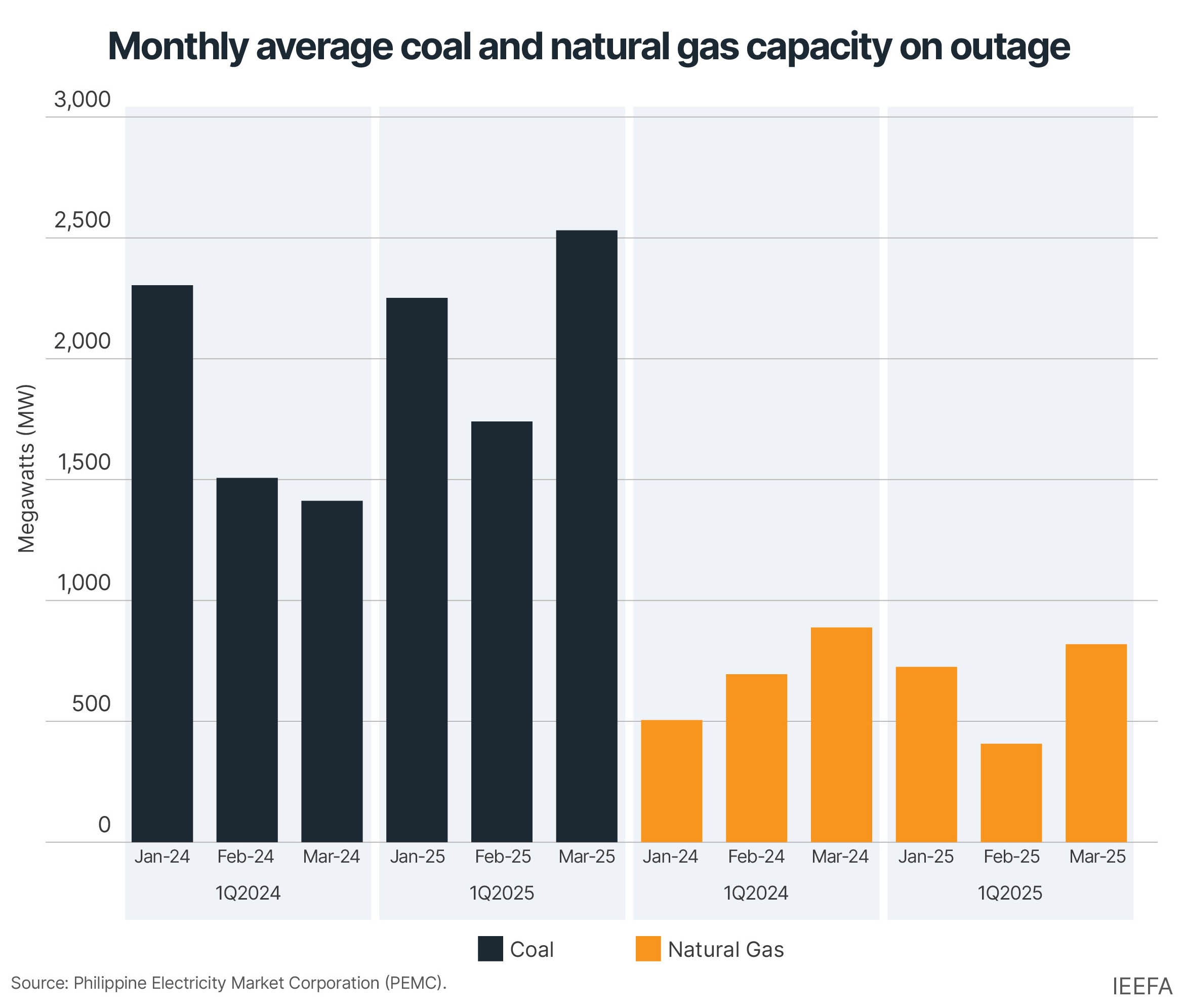 Outages at fossil fuel generators in the Philippines occur every year — mainly during hot, dry months — but the average coal plant capacity on outage in 1Q2025 was markedly higher than the same period last year. By contrast, natural gas capacity on outage was slightly lower in the first quarter.