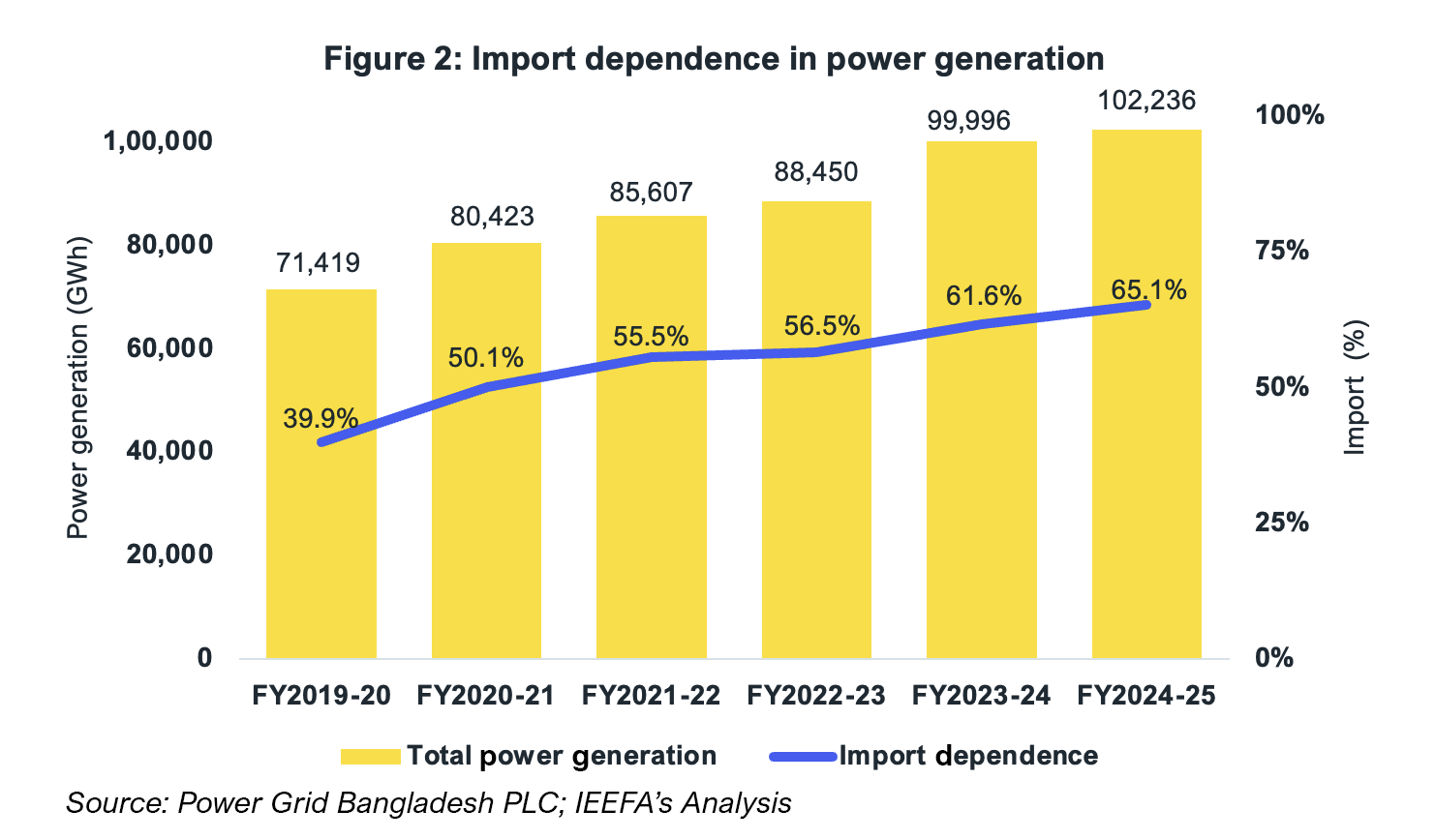Despite Bangladesh having increased its power generation capacity, the sector’s troubles have deepened due to its heavy reliance on fossil fuel imports. In the fiscal year (FY) 2024-25, imports accounted for approximately 65% of the country’s total power supply (this includes imported electricity and imported fuels used in electricity generation). Such dependence surged by 63% between FY2019-20 and FY2024-25, significantly outpacing the 43% increase in power generation over the same period (see Figure 2).