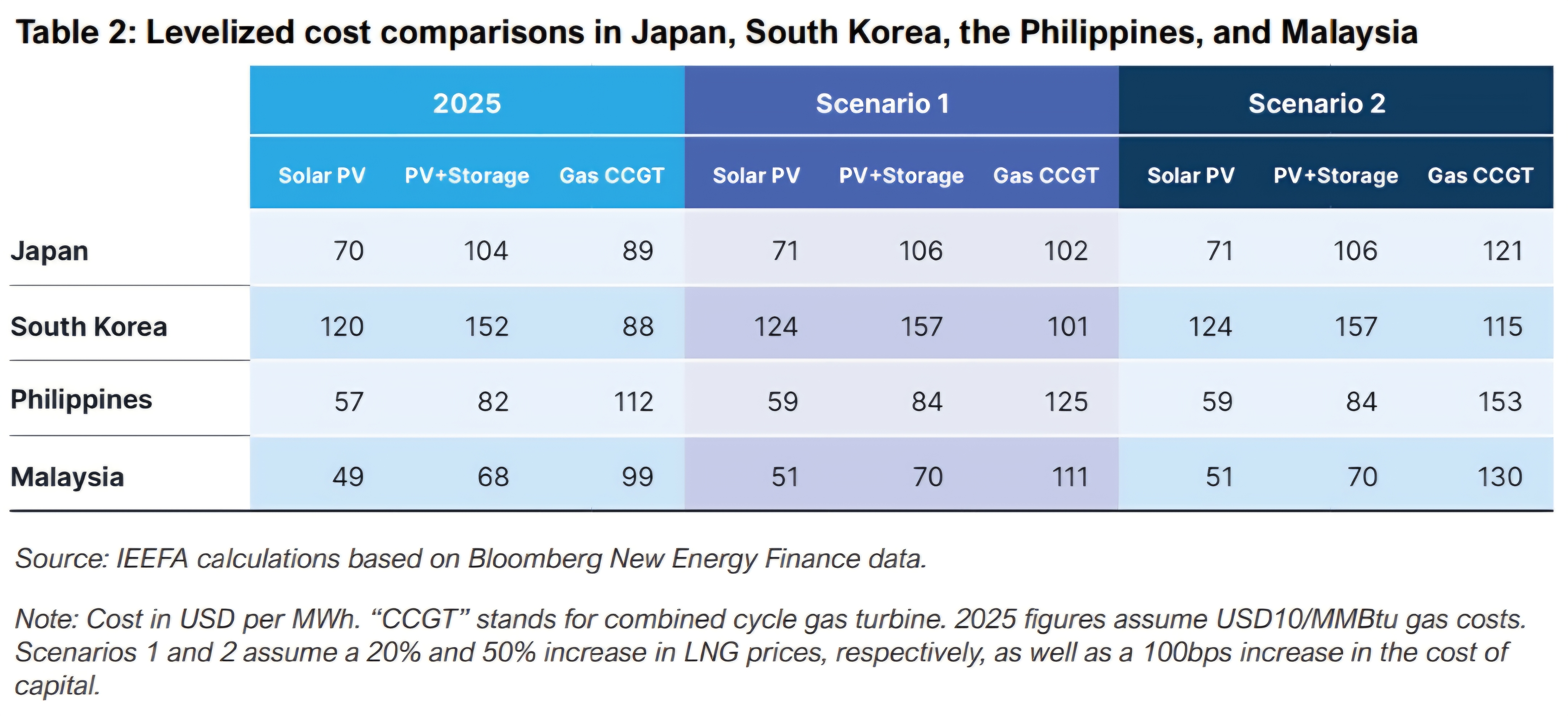 At current LNG prices, the levelized cost of electricity from gas-fired power is 3–4 times the global average for solar and wind, and gas-fired power is uncompetitive with solar plus storage in many Asian markets. IEEFA estimates that every 1 gigawatt (GW) of solar could avoid USD3 billion in LNG import costs over 25 years.