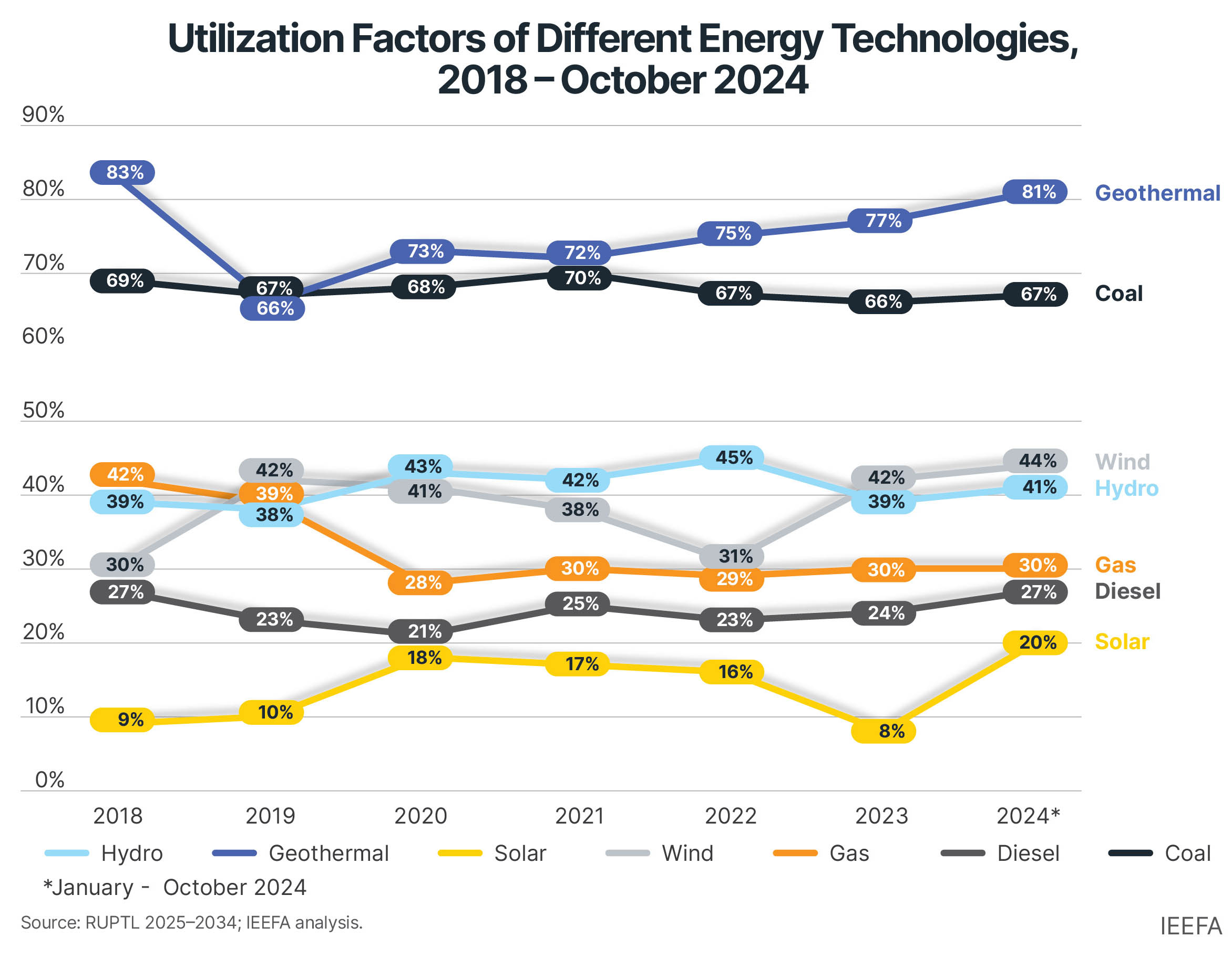 Meanwhile, the utilization of solar and wind has remained stable, though at a low installed base. Solar and wind have operated at utilization factors of 20% and 44%, respectively. Notably, these exceeded global expectations, where solar typically operates at 16.2% and wind at 36%, reinforcing their viability as scalable solutions.