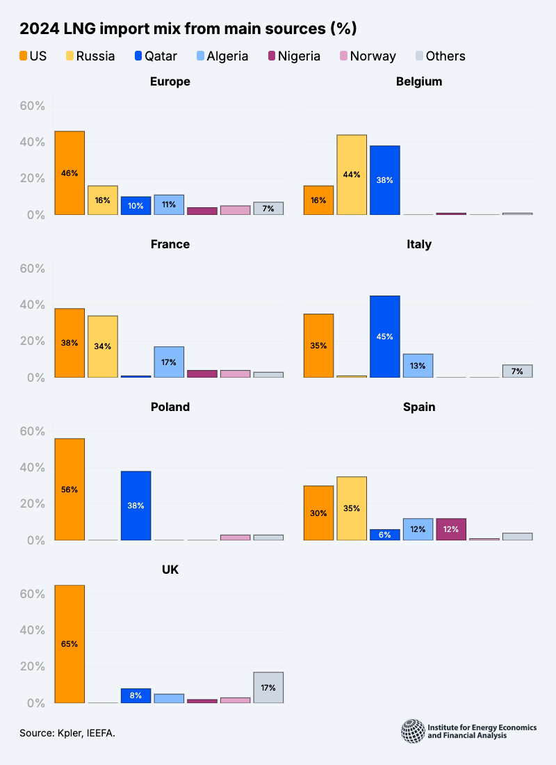 Almost half (45%) of Italy’s LNG imports were from Qatar in 2024. That figure was 38% for both Belgium and Poland.