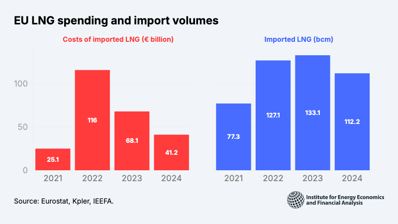 High gas prices in 2022 and increased LNG imports led EU Member States to spend about €116 billion on LNG that year. EU countries spent about €225.3 billion on LNG imports in the three years between 2022 and 2024.