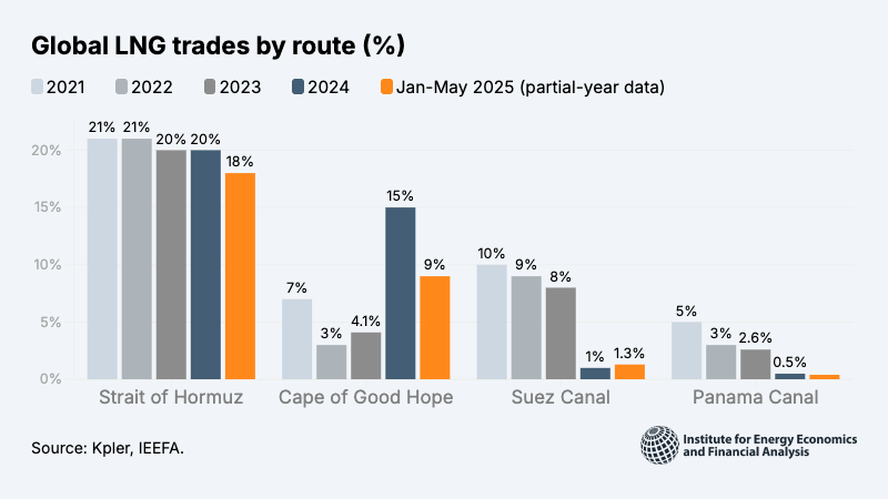 In 2021, 7% of LNG trades were via the Cape of Good Hope, 10% via the Suez Canal and 5% via the Panama Canal. In 2024, 15% of LNG trades were via the Cape of Good Hope, 1% via the Suez Canal and 1% via the Panama Canal.